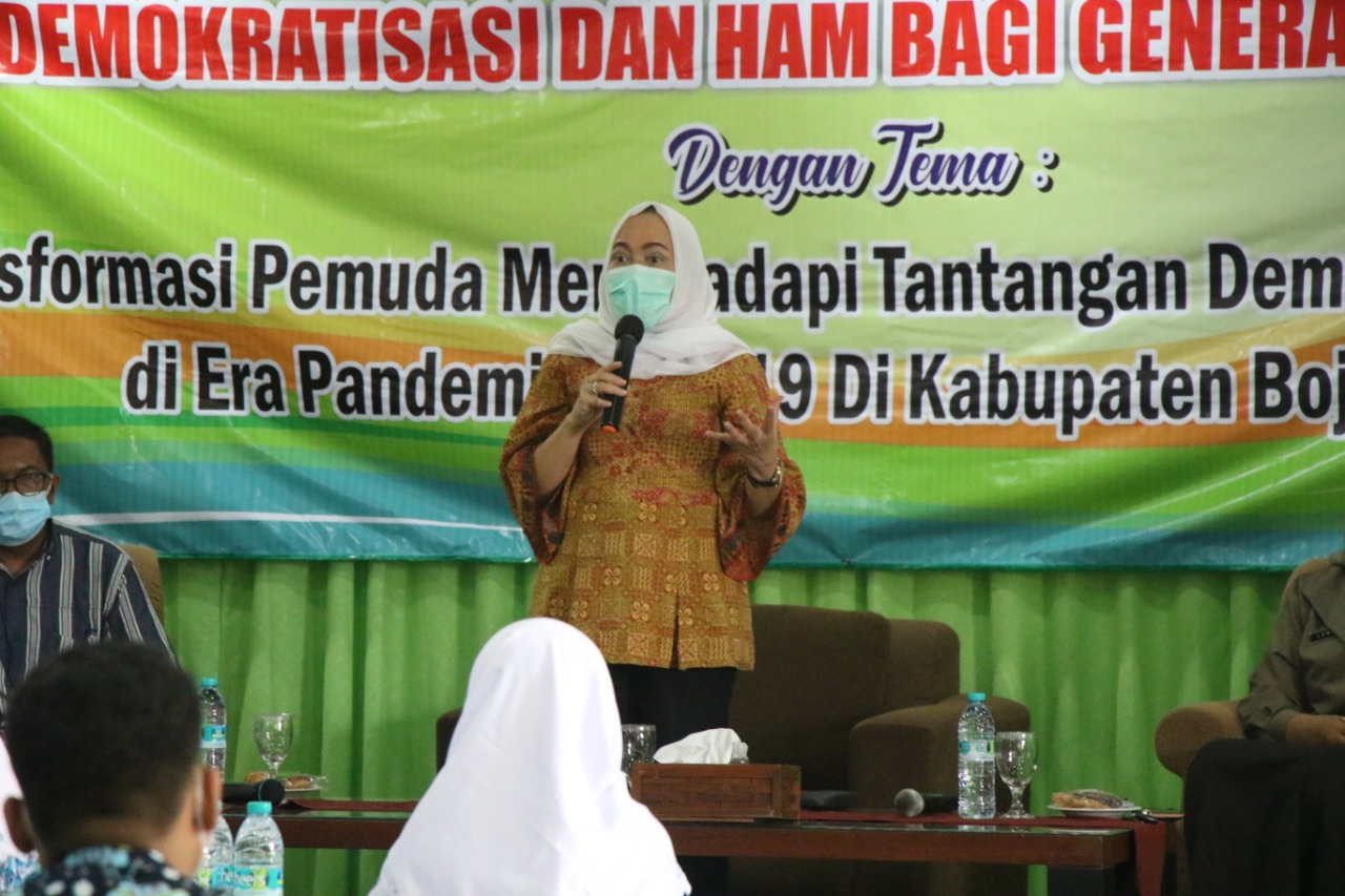 Bupati Bojonegoro Anna Muawanah menyampaikan transformasi pemuda sangat diperlukan untuk menghadapi tantangan Demokrasi dan HAM khususnya di Era pandemi Covid19 seperti saat ini. Dimasa pandemi, bupati berharap generasi muda tetap menjadi agen perubahan di Bojonegoro dengan ikut mengendalikan Covid19 namun juga tidak mengesampingkan Demokrasi yang menjadi sistem pemerintahan di NKRI. Selain itu tingkatkan toleransi antar sesama agar tidak melanggar HAM meskipun banyak sekali tantangan. “Sistem Demokrasi jangan sampai hilang,