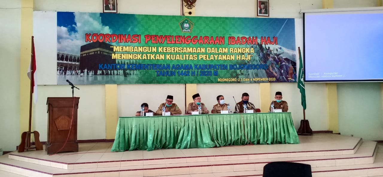 HarianJatim.comBojonegoro-Kantor Kemenag Bojonegoro Melalui Seksi Penyelenggara Haji dan Umroh pada Kantor Kemenag Bojonegoro menyelenggarakan rapat koordinasi tentang penyelenggaraan Ibadah Haji yang dilaksanakan di aula Kemenag ,Senin (2/11/2020)