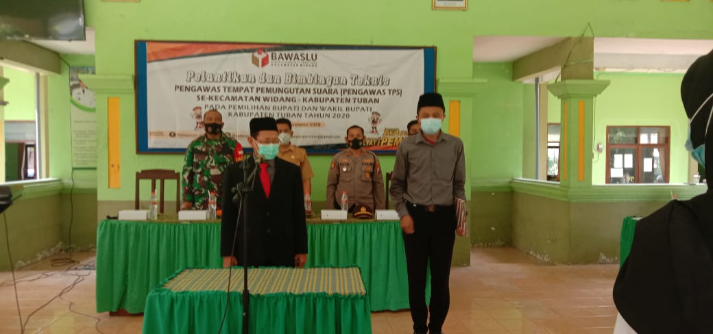 Kegiatan pelantikan pengawas TPS yang digelar di Pendopo Kecamatan Widang Kabupaten Tuban, dihadiri juga oleh Plt. Camat Widang, Kapolsek Widang, Ketua Panwascam Widang dan PPS serta PPK tingkat Desa Se- Kec.Widang.