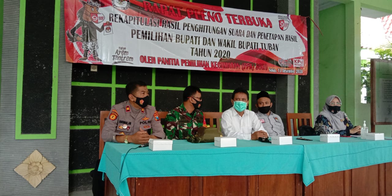 Nampak Hadir dalam acara kegiatan Rapat Pleno penghitungan Suara Tingkat kecamatan ( PPK) di pendopo kecamatan Soko diantaranya Kapolsek Soko IPTU Khoirul Ahmad, Waka Polsek,Kanit Reskrim Polsek Soko,Kanit Intelkam Polsek Soko,Kanit Binmas Polsek Soko,Danramil Soko Kapt Inf Pri Wahyudi,