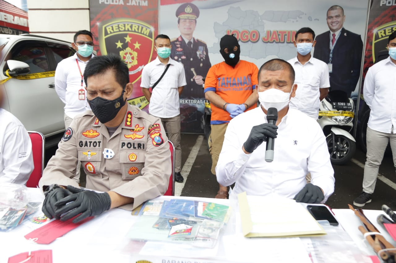 HarianJatim.comSurabaya-Direktorat Kriminal Umum (Ditreskrimum) Polda Jatim. Membekuk satu orang tersangka pemalsu surat keterangan palsu kedalam akta autientik atau penipuan atau penggelapan berkaitan dengan SHM 656 dan 657. Yang terjadi pada tahun 2017 sampai 2019 yang terjadi di Kabupaten Sidoarjo.
