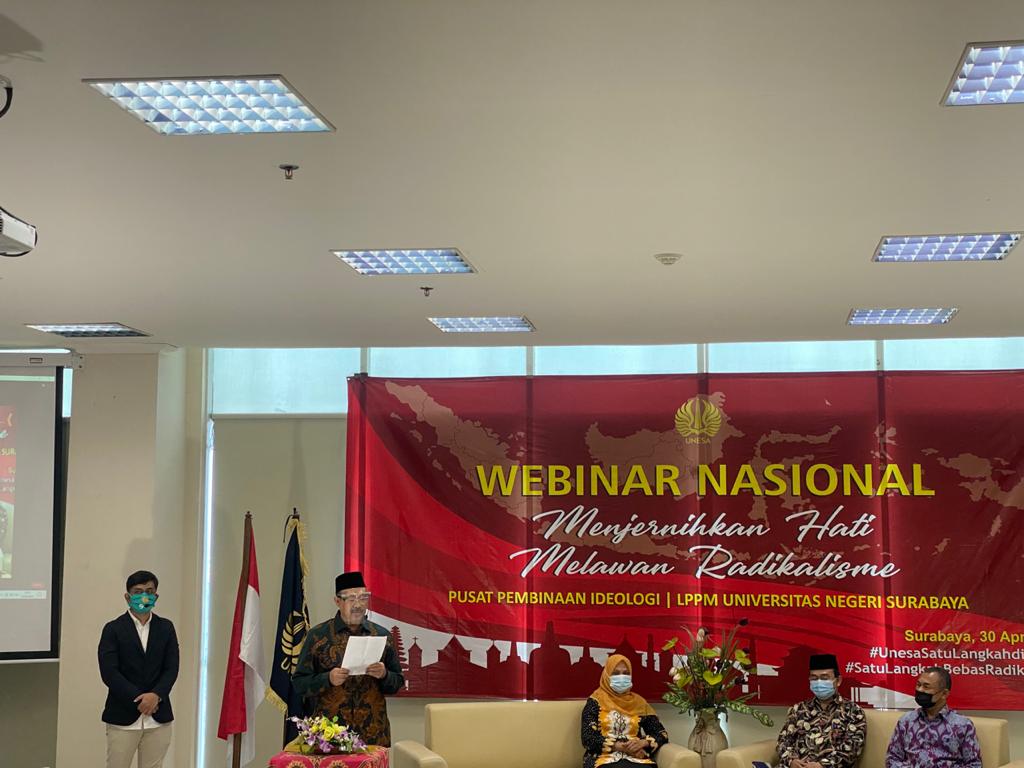 HarianJatim.comSurabaya-Sebagai upaya menangkal paham radikalisme, Pusat Pembinaan Ideologi LPPM Universitas Negeri Surabaya menyelenggarakan Webinar Nasional dengan tema Menjernihkan Hati Melawan Radikalisme, jumat 30/04/2021.
