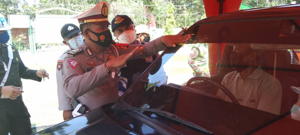 HarianJatim.comBojonegoro-Satuan Lalu Lintas ( Satlantas) polres Bojonegoro melalui Kanit Dikyasa memberikan Tanda Stiker pada kendaraan roda empat yang di putar balik melalui pos penyekatan Perbatasan Cepu Jawa Tengah tepatnya di Pos padangan, Selasa (11/05/2021)