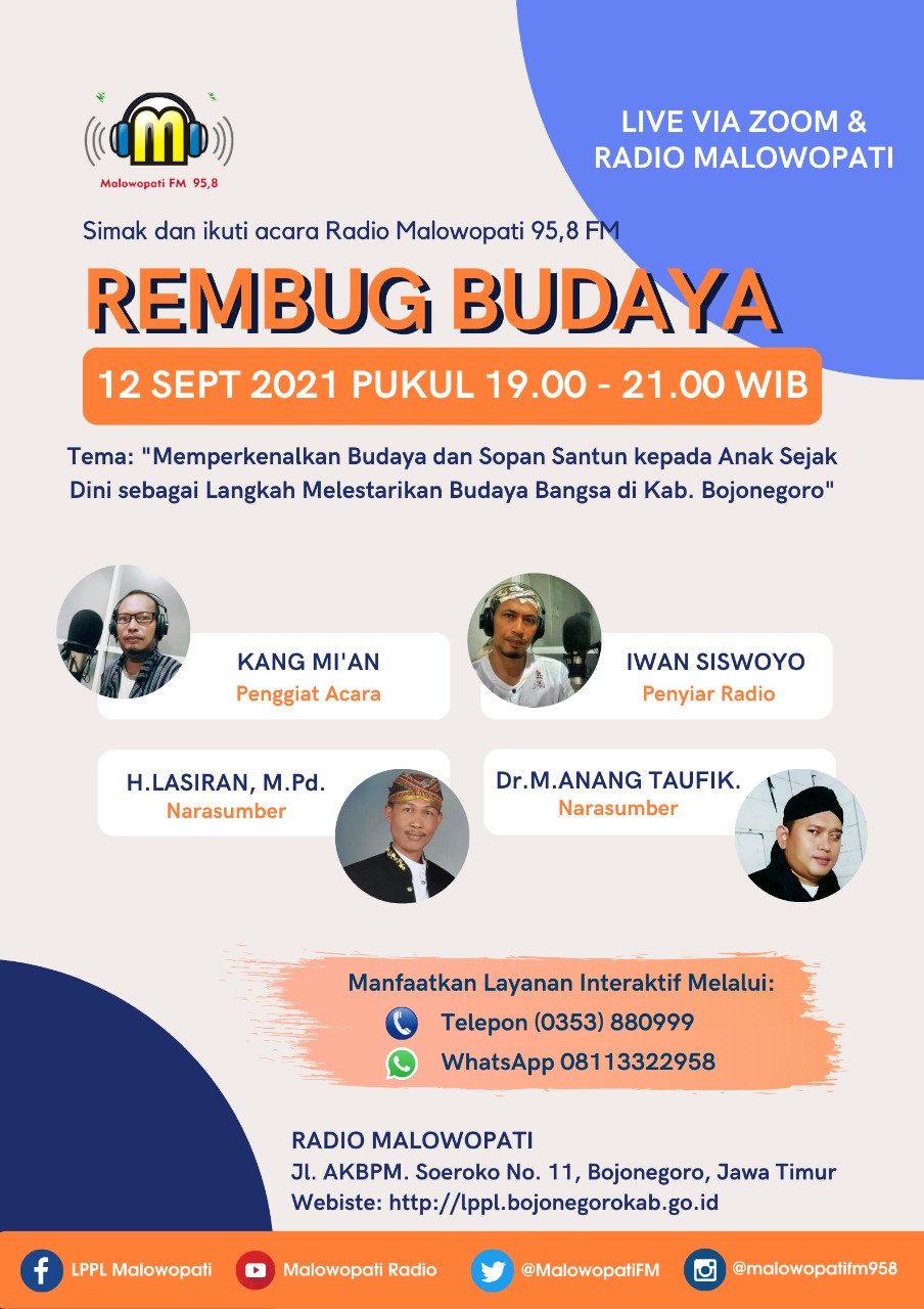 Hadir dalam acara Rembug Budaya Malowopati fm dengan Tema “Memperkenalkan Budaya dan Sopan santun kepada anak sejak dini sebagai langkah melestarikan budaya bangsa di kabupaten Bojonegoro” dengan Narasumber Dr Anang dan Lasiran M, Pd serta di pandu oleh Kang mian dan kang iwan