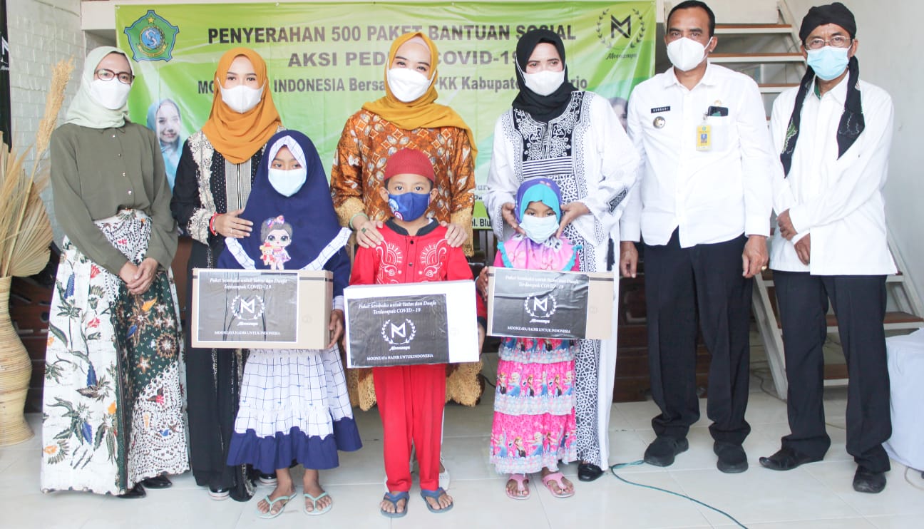 Ketua TP PKK Kabupaten, Bunda Sa’adah hadir langsung memberikan bantuan secara simbolis kepada 3 dhuafa dan 3 anak yatim piatu, didampingi Camat Sidoarjo, Sekretaris TP PKK Kabupaten, Kades Bluru Kidul serta Owner Monnzaya Indonesia, Nur Rahmawati Fauzi.Dalam kesempatan ini, Bunda Sa’adah menyampaikan kebanggan kepada UKM yang bergerak dibidang fashion khususnya produksi tas brand lokal Sidoarjo ini.