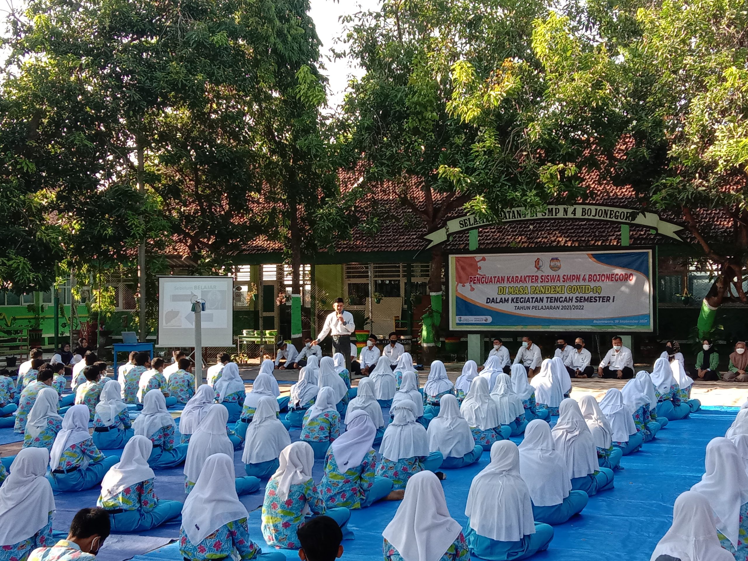 Kegiatan Penguatan Karakter Semangat Belajar oleh Motivator Pendidikan Qoharudin di laksanakan di Lapangan Takraw SMPN 4 Bojonegoro, Rabu (29/09/2021) dengan Tetap Mematuhi protokol Kesehatan Pencegahan Covid-19 Secara Ketat dan di Bagi Menjadi Dua Sesi untuk menghindari adanya kerumunan siswa