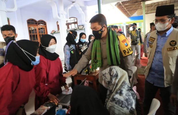 Untuk Jawa Timur, vaksinasi berlangsung di Pondok Pesantren (Ponpes) Ar-Rowiyah Macingan, Desa Langpanggang, Kecamatan Modung, Kabupaten Bangkalan, yang diikuti Kapolri Jenderal Listyo Sigit Prabowo secara Virtual.