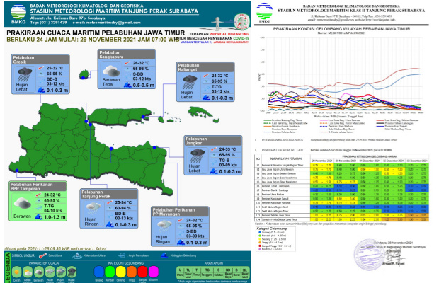 Sedangkan ketinggian gelombang laut di Selat Madura antara 0.1 – 0.3 m, di Laut Jawa bagian timur antara 0.5 – 2.3 m, sedangkan di Samudera Hindia selatan Jatim antara 1.3 – 2.3 m.