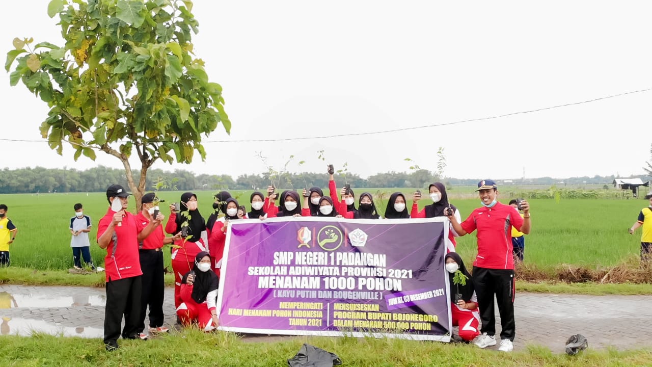 Bojonegoro-HarianJatim.com,Dalam Rangka Memperingati Hari Menanam Pohon Indonesia Seluruh Tenaga Pendidik dan Kependidikan Serta Siswa/i SMPN 1 Padangan melaksanakan penanaman Tanaman kayu putih dan Bougenville di Sepanjang jalan Desa Ngoken Kecamatan Padangan, Jum’at (3/12/2021)
