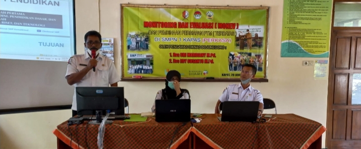 Pada kesempatan ini, tim Monev juga memberikan pengarahan kepada seluruh Tenaga Pendidik dan Kependidikan SMPN 1 Kapas mengenai Program menyongsong pembelajaran tatap muka terbatas, peningkatan mutu pendidikan