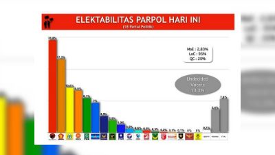 “Tingkat elektabilitas partai politik tertinggi diraih oleh PDIP (21,8%). Disusul Partai Gerindra (17,3%) dan Partai Golkar (10,6%). Masih ada 13,3% yang belum menentukan pilihan (undecided voters),” demikian hasil temuan survei Trust Indonesia.