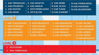 Adapun daftar Kabupaten/Kota di Jatim yang menerapkan level PPKM 1, 2 dan 3 sebagai berikut.