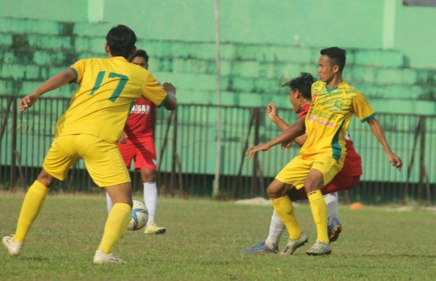 Pemain Perssu Sumenep saat melakukan uji coba dengan Madura FC di Lapangan Bola Stadion A. Yani Sumenep, Sabtu, (2/10/2021). (Hoki for Harianjatim.com)