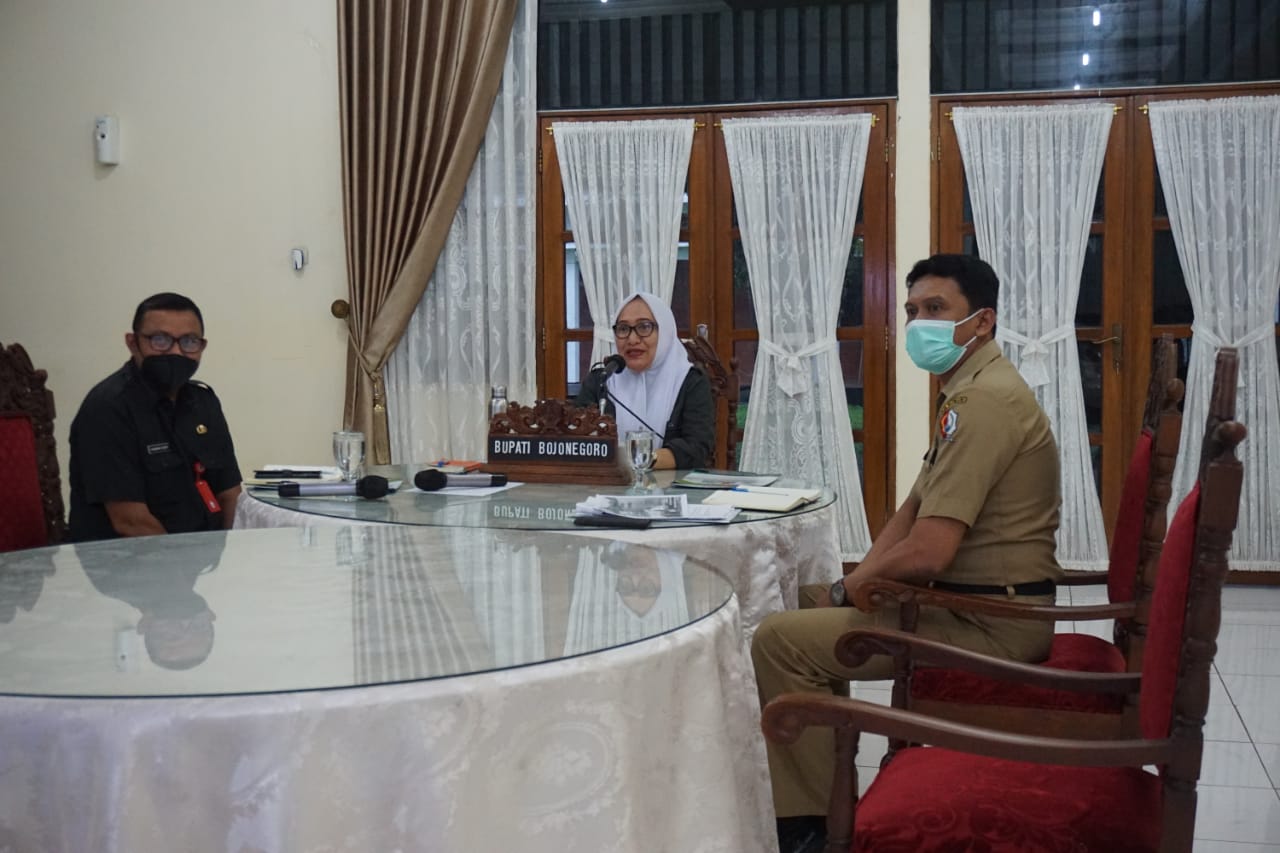 Bupati Bojonegoro Anna Mu’awanah didampingi Asisten Perekonomian dan Pembangunan, serta Kepala Bagian Perekonomian berkesempatan telewicara zoom meeting bersama Konsulat Jenderal Republik Indonesia di Frankfurt Jerman Acep Soemantri, dan Jovi Puspa selaku Ketua Merpati e.V panitia inisisator IFF 2022, Selasa (8/3/2022). Guna mempresentasikan nilai-nilai, profesionalisme, komitmen, dedikasi, dan toleransi yang melandasi terselanggaranya Indonesia Festival Frankfurt 2022. Saat ini, KJRI Frankfurt telah menerima komitmen dari Pemprov DI Yogyakarta, Pemkot Pontianak, dan Kabupaten Bojonegoro.