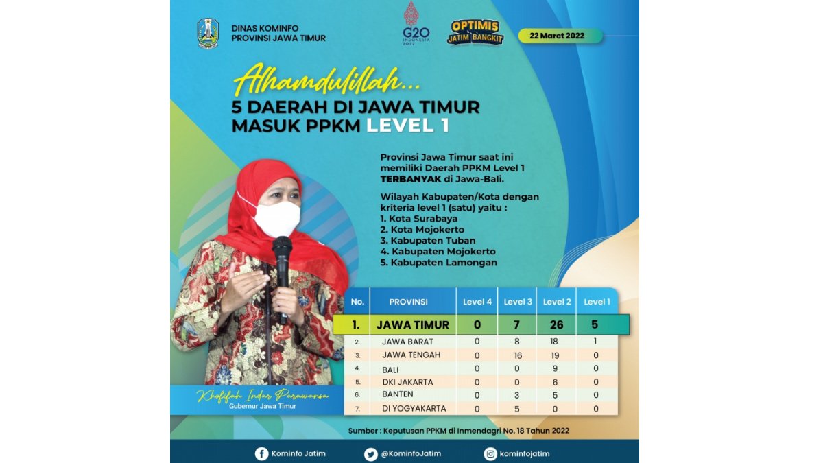 Terdapat lima Kabupaten/Kota di Jawa Timur yang terapkan PPKM Level 1, diantaranya Kota Surabaya, Kota Mojokerto, Kabupaten Tuban, Kabupaten Mojokerto, dan Kabupaten Lamongan. Jumlah tersebut terbanyak yang menerapkan level 1 untuk daerah Jawa-Bali.