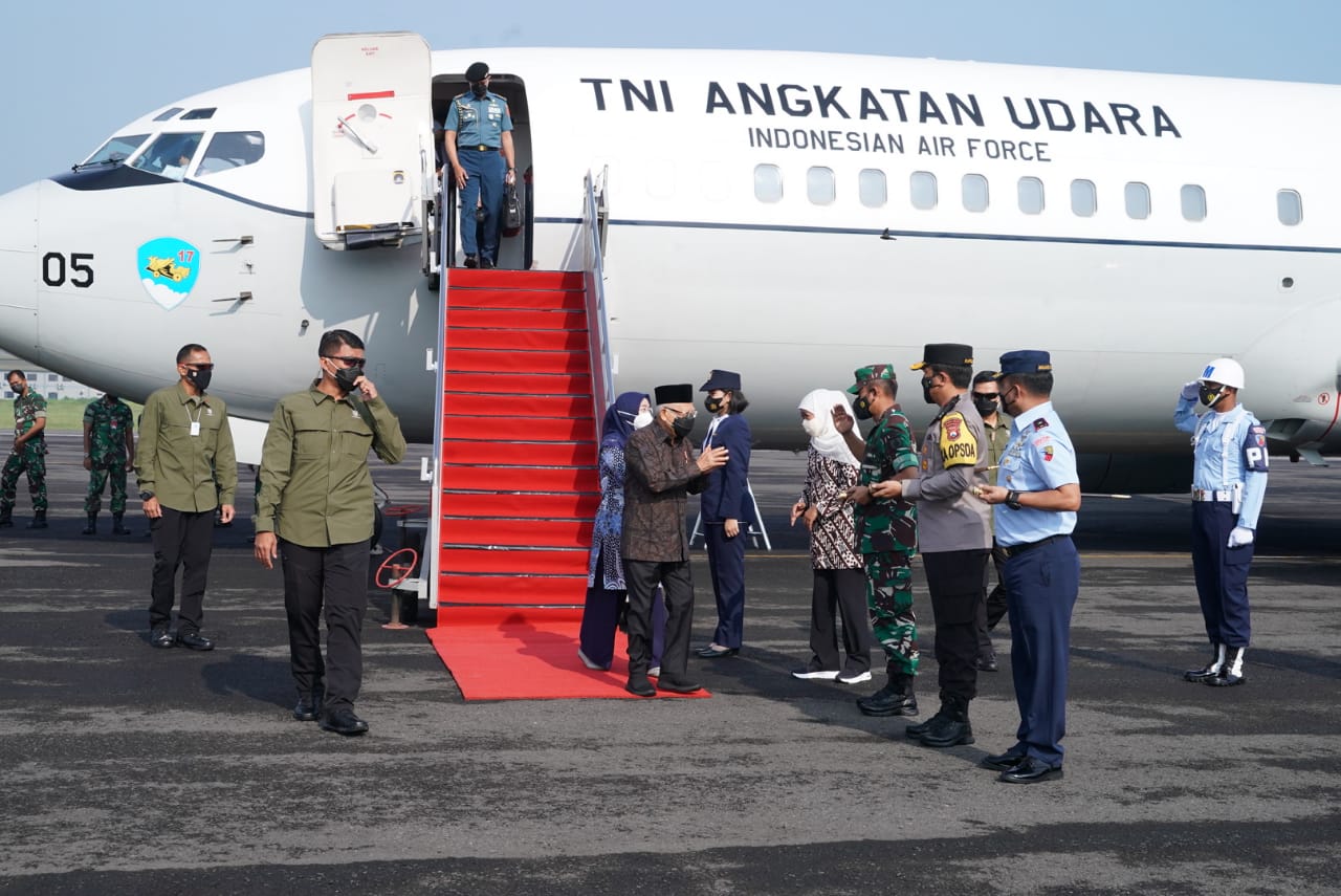 Sekitar pukul 07.00 WIB, Wapres beserta rombongan terbatas menggunakan Pesawat Boeing 737-400 TNI AU menuju Pangkalan TNI AU Iswahjudi Madiun. Wapres disambut oleh Gubernur Jawa Timur Khofifah Indar Parawansa beserta jajaran anggota Forkopimda Provinsi Jawa Timur.