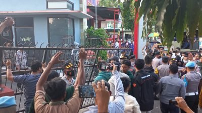 Mahasiwa terus mencoba menerobos kawat berduri untuk masuk ke dalam Gedung DPRD Sumenep. Berbagai upaya dilakukan, seperti yang sebelumnya berorasi tepat di depan Gedung DPRD Sumenep, mereka beralih posisi di depan pintu masuk Gedung Wakil Rakyat di Jalan Trunonoyo itu.
