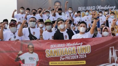 Bangkalan-harianjatim.com. Ratusan relawan yang tergabung dalam Sahabat SandiUno Madura Raya mendeklarasikan dukungan ke Menparekraf Sandiaga Uno sebagai presiden 2024. Dukungan hadir karena Sandiaga dinilai bisa menjawab segala persolan, terutama masalah ekonomi.