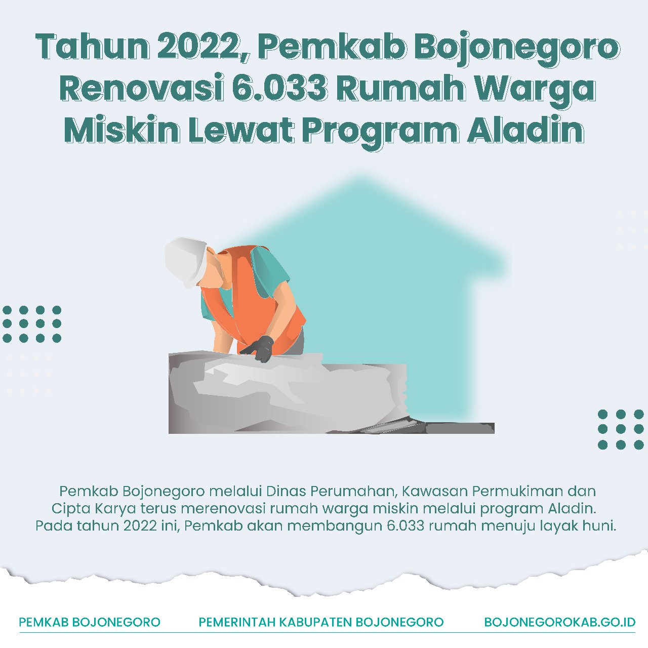 Bojonegoro –harianjatim.com, Pemkab Bojonegoro melalui Dinas Perumahan, Kawasan Permukiman dan Cipta Karya terus merenovasi rumah warga miskin melalui program Aladin. Pada tahun 2022 ini, Pemkab akan membangun 6.033 rumah menuju layak huni.