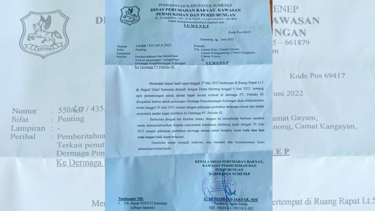 “Menindak lanjuti hasil rapat tanggal 27 Mei 2022 bertempat di Ruang Rapat Lt.5 de Bagraf Hotel Sumenep disusuli dengan Zoom Meeting tanggal 9 Juni 2022 tentang opsi pemancangan untuk sandar kapal secara vertical di dermaga PT. Pelindo III disepakati bahwa untuk penutupan Dermaga Penyeberangan Kalianget akan dilaksanakan mulai tanggal 20 Juni 2022 sampai dengan pekerjaan perbaikan dermaga selesai dan untuk sementara sandar kapal dialihkan ke Dermaga PT. Pelindo III,” tulis dalam surat tersebut.