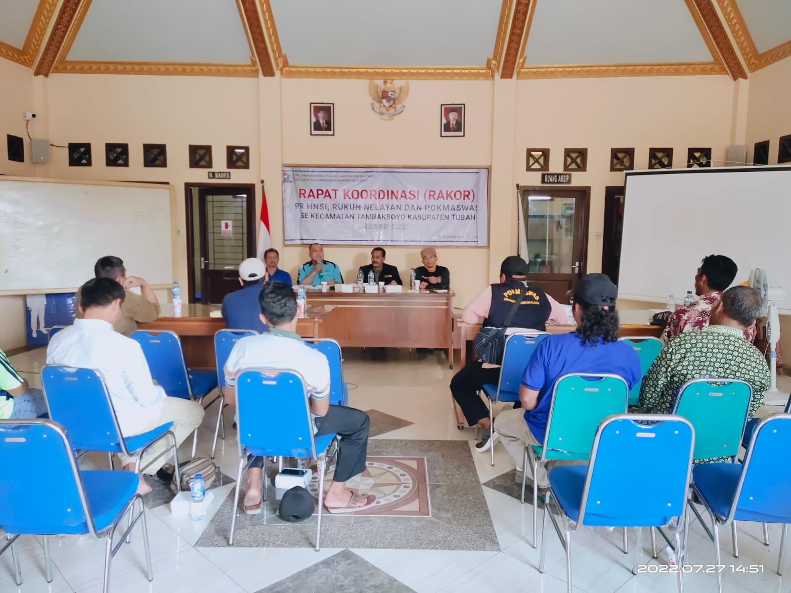 Tuban-harianjatim.com. Cuaca ekstrim dan gelombang tinggi di laut yang merenggut 4 (empat) korban jiwa nelayan di Tuban, serta alat tangkap yang meresahkan nelayan, Pimpinan Ranting HNSI (Himpunan Nelayan Seluruh Indonesia) Kecamatan Tambakboyo, gelar rapat koordinasi bersama ketua RN (Rukun Nelayan) dan POKMASWAS (Kelompok Masyarakat Pengawas) se Kecamatan Tambakboyo, Rabu (27/7/2022).
