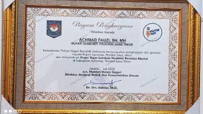 Sumenep -harianjatim.com.Kementerian Dalam Negeri Republik Indonesia memberikan penghargaan dan apresiasi kepada Bupati Sumenep Achmad Fauzi SH.MH atas Terbentuknya Gugus Tugas Gerakan Nasional Revolusi Mental di kabupaten Sumenep