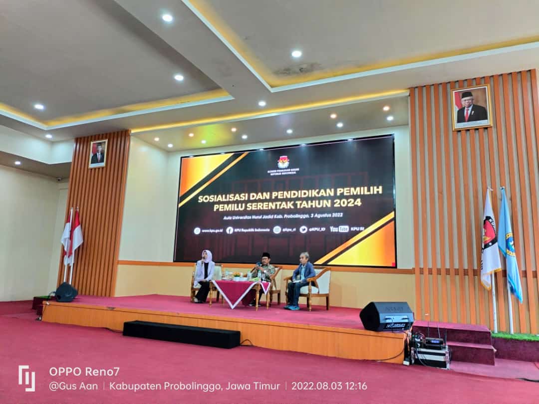 HarianJatim.Probolinggo.Com- Para audiens dari berbagai lapisan masyarakat kabupaten Probolinggo, Rabu (3/8) tadi siang hanyut dalam harmoni diskusi yang tersaji saat acara Sosialisasi Pemilu 2024 di Aula megah UNUJA. Giat kolaborasi antara DPR RI, KPU RI, KPU Provinsi Jatim dan KPU Kabupaten Probolinggo merupakan giat Pendidikan Pemilih yang muara akhirnya bertujuan agar partisipasi masyarakat dalam Pemilu akan meningkat.
