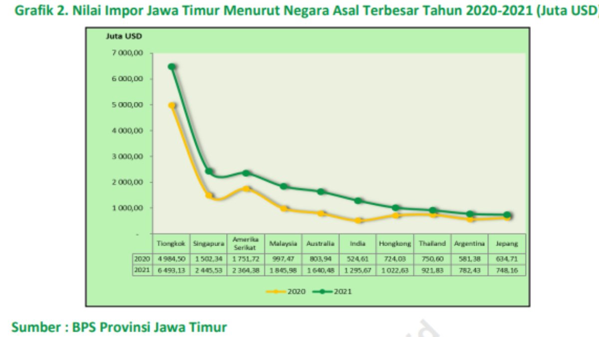 Melansir laman resmi Badan Pusat Statistik Provinsi Jawa Timur (BPS Jatim) pada 11 Agustus 2022 dalam laporan “Statistik Impor Provinsi Jawa Timur 2021”, tercatat total nilai impor Provinsi Jawa Timur dengan sepuluh negara mitra dagang tersebut pada tahun 2021 mencapai 19.560,21 juta Dollar AS.