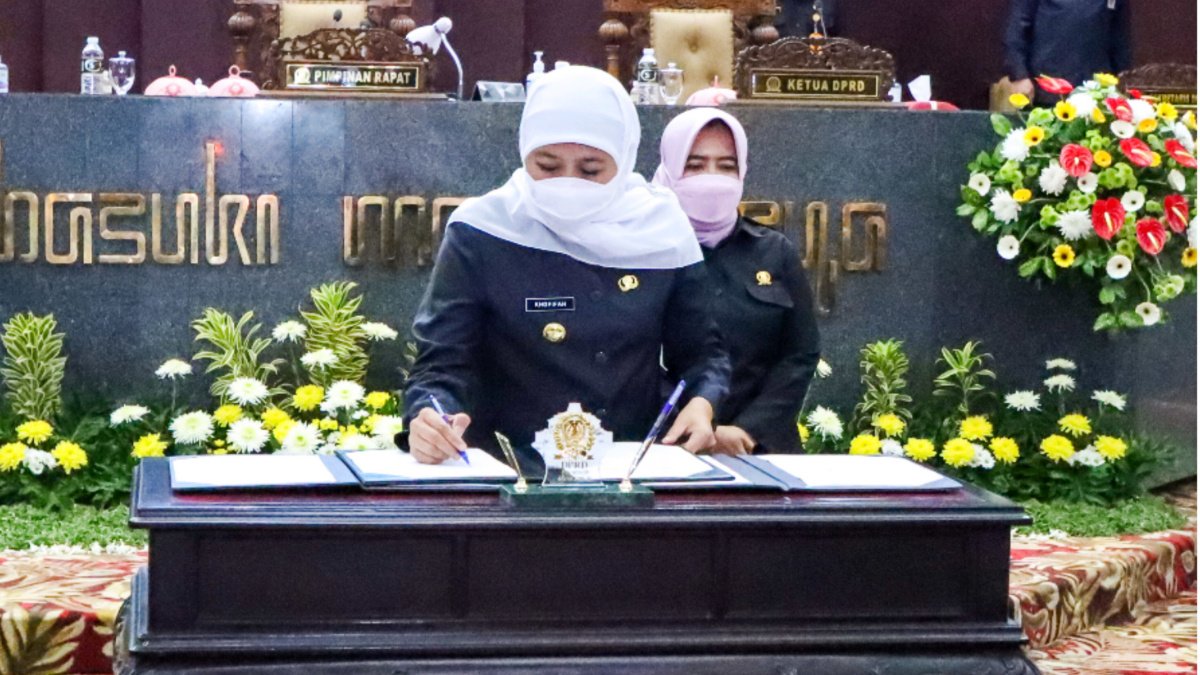 Surabaya-harianjatim.com. Gubernur, Khofifah Indar Parawansa dan Dewan Perwakilan Rakyat Daerah (DPRD) Jatim mendatangani nota kesepahaman Kebijakan Umum Anggaran Prioritas dan Plafon Anggaran Sementara (KUA PPAS) APBD Jatim tahun 2023 pada rapat paripurna DPRD Jatim, Jumat (12/9/2022).