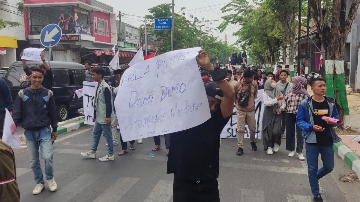 Massa aksi melakukan longmarch dari monumen Arek Lancor Pamekasan menuju Gedung DPRD setempat. Demonstrans menyampaikan aspirasinya sepanjang jalan. Termasuk di gedung DPRD.