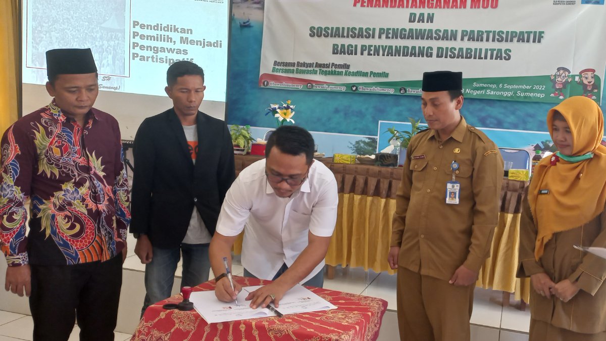 Penandataganan MoU bersama tiga kelompok itu, yakni Sekolah Luar Biasa (SLB) Negeri Sumenep, Gerakan Kesejahteraan Tuna Rungu Indonesia (Gerkatin) Sumenep, dan Ikatan Tunanetra Muslim Indonesia (ITMI) Sumenep dilakukan di SLB Negeri Sumenep, Selasa, (6/9/2022), oleh Ketua Bawaslu Sumenep Anwar Noris, Kepala SLB Ali Badwi, Ketua Muhamaad Rizal Ketua Gerkatin Sumenep, dan Ketuta ITMI Sumenep.