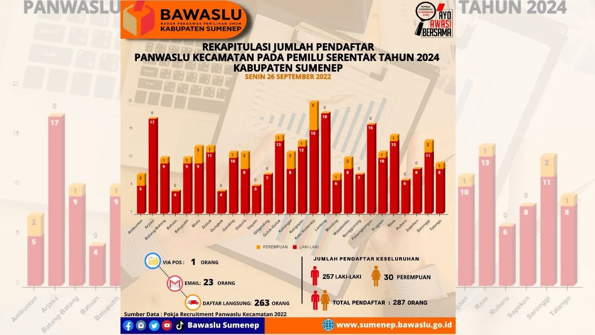 Pendaftar yang melakukan pendaftaran melalui pos sebanyak 1 pendaftar. Sebanyak 23 pendaftar mendaftar melalui email dan 263 pendaftar mendaftar secara manual dengan cara datang langsung ke Kantor Bawaslu Sumenep Jl. KH Mansyur No.64, Pangarangan, Kecamatan Kota Sumenep.