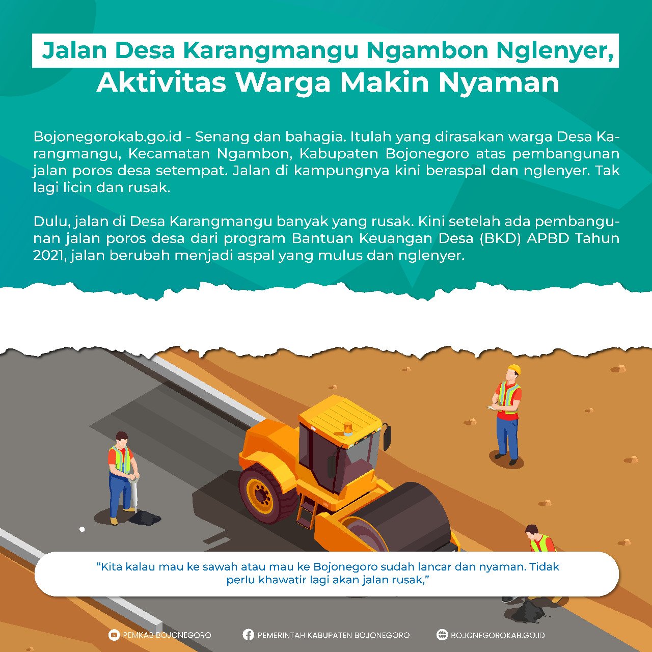 “Dengan pembangunan jalan aspal yang bagus kini, masyarakat menjadi nyaman untuk berkendara. Tidak perlu khawatir jatuh. Sebelumnya warga di sini was-was karena setiap hujan jalan licin sehingga harus berhati-hati agar tidak terjatuh,” ungkapnya.