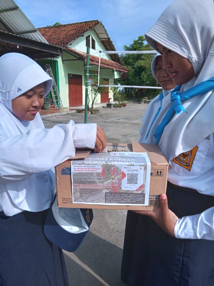 Bojonegoro -harianjatim.com.Dalam Rangka Meringankan Beban Masyarakat Cianjur Jawa Barat yang Terkena Musibah Gempa Bumi Seluruh Siswa/i SMPN 1 Kapas Menyalurkan Donasi Kemanusiaan Melalui PMI Kabupaten Bojonegoro,Rabu (30/111/2022)