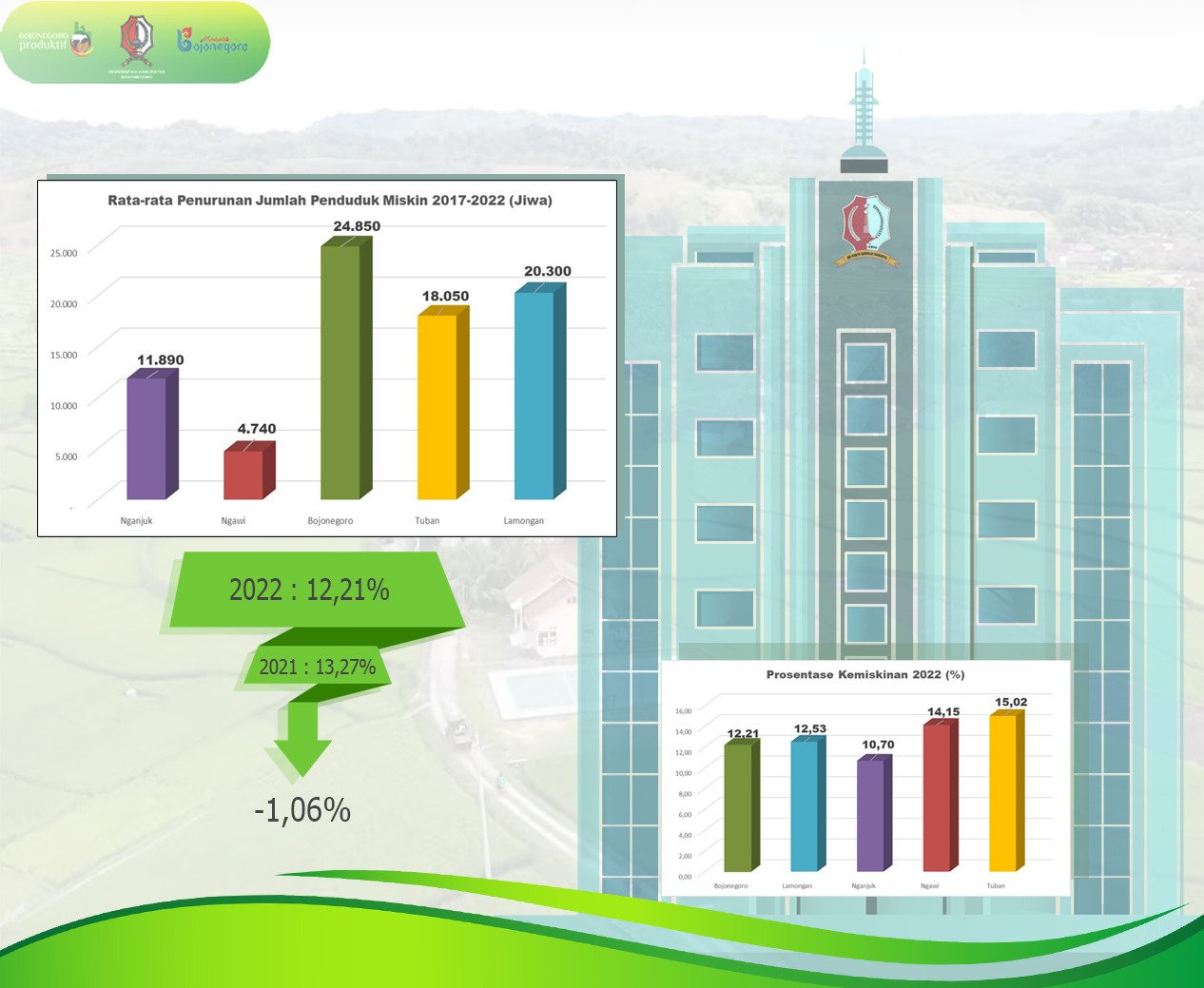 Sebagaimana data BPS, capaian ini paling baik dalam 5 tahun terakhir. Capaian persentase kemiskinan Bojonegoro tahun 2022 lebih baik dari Lamongan, Ngawi, dan Tuban. Persentase kemiskinan Bojonegoro 12,21%, Kabupaten Lamongan 12,53%, Kabupaten Ngawi 14,15%, dan Kabupaten Tuban 15,02%.