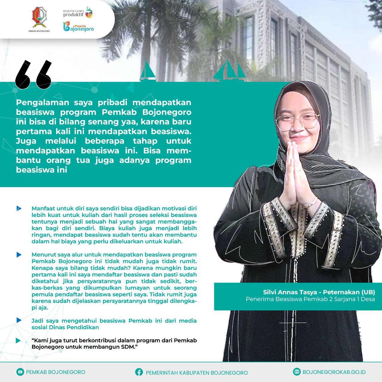 Silvi juga berpesan kepada adik-adik mahasiswa, khususnya yang berasal dari Bojonegoro. Katanya, jika ada program beasiswa dari pemerintah atau swasta untuk segera mencari informasi lengkap di website dan medsos. Apalagi di Bojonegoro sudah ada beberapa program beasiswa dari Pemkab.