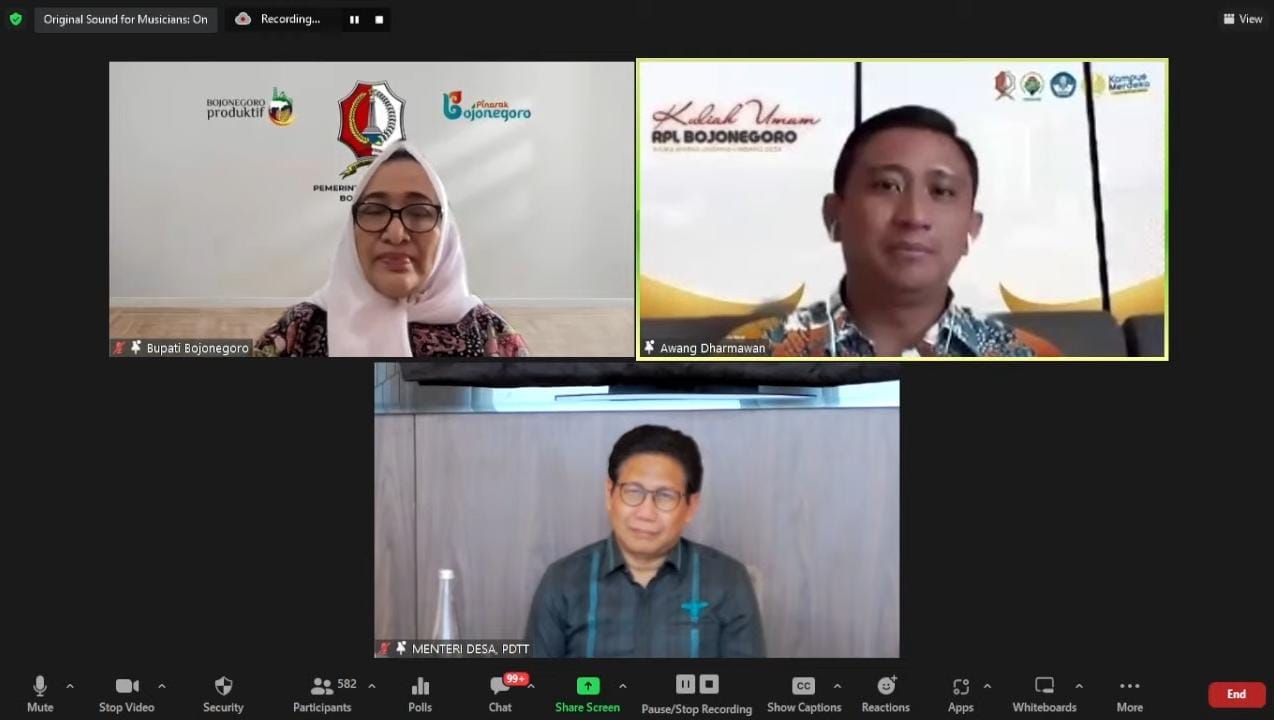 Bojonegoro -harianjatim.com.Bupati Bojonegoro Anna Mu’awanah, dan Menteri Desa Pembangunan Daerah Tertinggal dan Transmigrasi (PDTT) Abdul Halim Iskandar memberi kuliah umum dengan tema ‘Nawa Warsa Undang-undang Desa’, Kamis (19/1/2023). Kuliah umum dilakukan secara virtual melalui zoom meeting kepada mahasiswa RPL (Rekognisi Pembelajaran Lampau) Desa, Kabupaten Bojonegoro di Universitas Negeri Surabaya (Unesa).