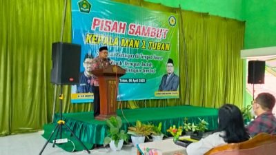 harianjatim.com tuban-Kepala Kantor Kementerian Agama Kabupaten Tuban, Ahmad Munir menghadiri acara Pisah Sambut Kepala MAN 1 Tuban sekaligus serah terima jabatan dari Moh. Badar yang telah memasuki masa pensiun kepada Kepala MAN 1 Tuban yang baru, Hudan Mabruri, Kamis siang (06/04/2023).