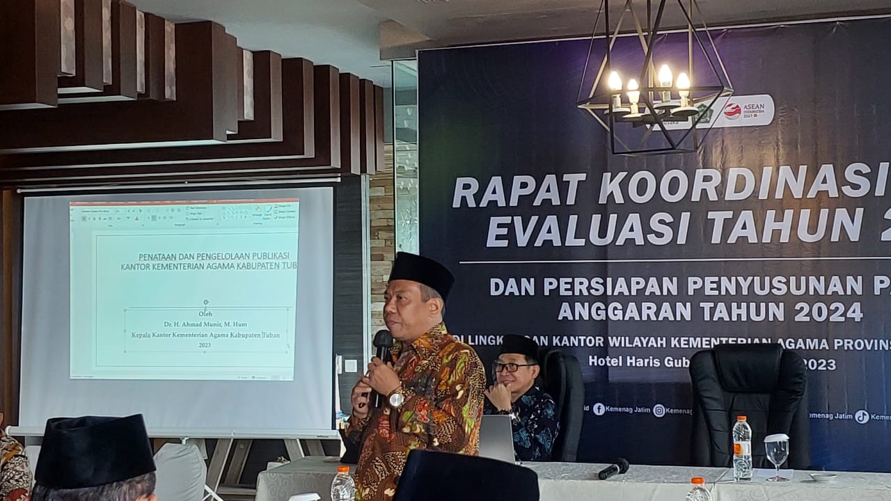 harianjatim.com-Surabaya.Kepala Kantor Kementerian Agama Kabupaten Tuban, Ahmad Munir berkesempatan memberikan paparan mengenai Penataan dan Pengelolaan Publikasi Kemenag Tuban dihadapan Kasubag TU dan Perencana se-Jawa Timur di hotel Harris Gubeng Surabaya, Rabu (10/5/2023).