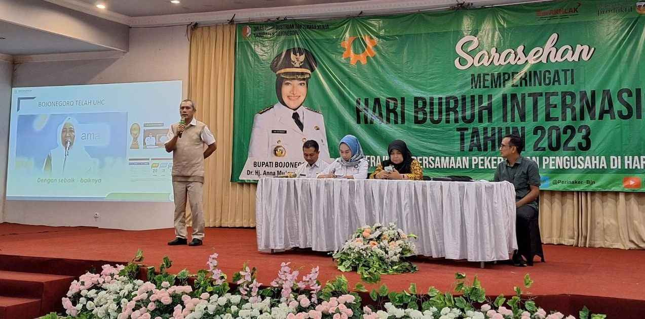 Harianjatim.com-Bojonegoro. Pemerintah Daerah Kabupaten Bojonegoro mengapresiasi kolaborasi antara Dinas Perindustrian dan Tenaga Kerja dengan BPJS Kesehatan Cabang Bojonegoro dalam menyukseskan Sarasehan May Day Tahun 2023 pada Jumat (12/05). Dalam acara tersebut, BPJS Kesehatan Cabang Bojonegoro turut berperan dalam mewujudkan peningkatan kesejahteraan bagi serikat pekerja dan keluarganya dengan mengusung tema “Merajut Kebersamaan Pengusaha dan Pekerja di Hari Fitri melalui Program Jaminan Kesehatan Nasional (JKN)”. Layanan kesehatan yang disediakan, seperti Aplikasi Mobile JKN, antrean online, dan Pelayanan Administrasi Melalui WhatsApp (PANDAWA), yang telah membuktikan kesungguhan BPJS Kesehatan dalam melayani peserta.