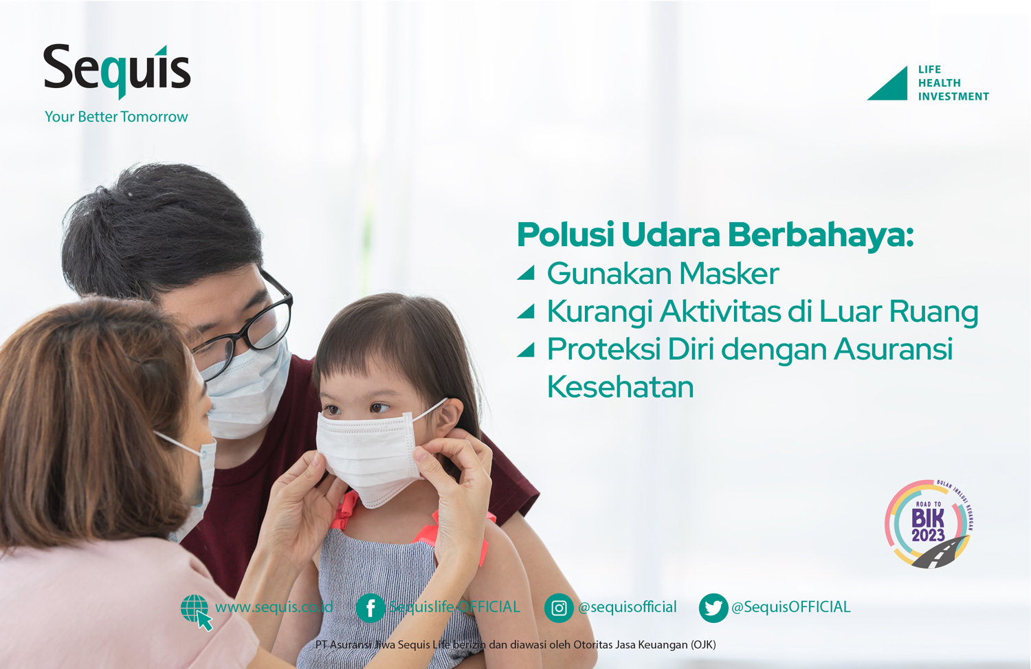 Head of Department Underwriting Sequis dokter Fridolin Seto mengingatkan masyarakat bahwa polusi dan memburuknya kualitas udara bisa berdampak buruk bagi kesehatan. “Gunakan masker saat berada di luar ruang meski pandemi telah usai untuk melindungi kita dari paparan virus dan berbagai penyakit yang mudah menular melalui udara serta mencegah paparan polusi udara. Jika tidak terlalu penting, hindari beraktivitas terlalu lama di ruang terbuka saat kualitas udara sedang memburuk,” sebut dr. Fridolin.