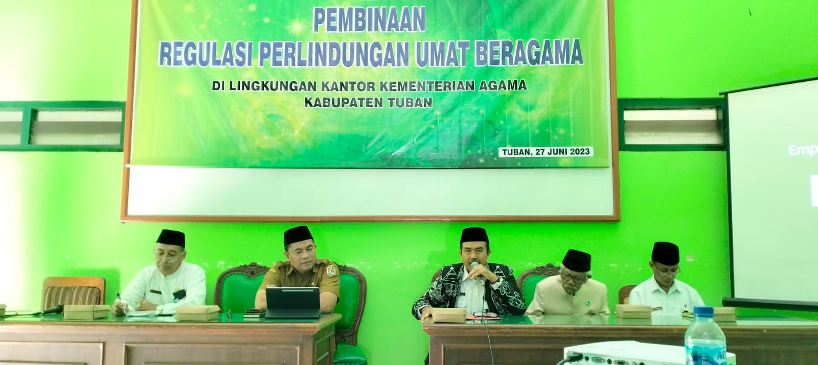 Tuban–harianjatim.com. Kementerian Agama Kabupaten Tuban menggelar giat bertajuk “Pembinaan Regulasi Perlindungan Umat Beragama” di aula Kemenag Tuban, Selasa (27/6/2023) dengan narasumber dari Bakesbangpol (Badan Kesatuan Bangsa dan Politik), Erkhamni. “Kesbangpol dan Kemenag terus bersinergi termasuk dengan semua tokoh lintas agama, untuk menciptakan kondisi yang harmonis dan dinamis,” ujarnya.