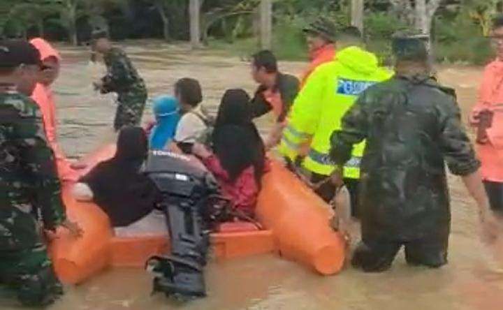Petugas kepolisian, TNI dan BPBD melakukan evakuasi kepada warga yang terjabak banjir, Selasa 12/3/24 (Foto: Tangkap layar video)