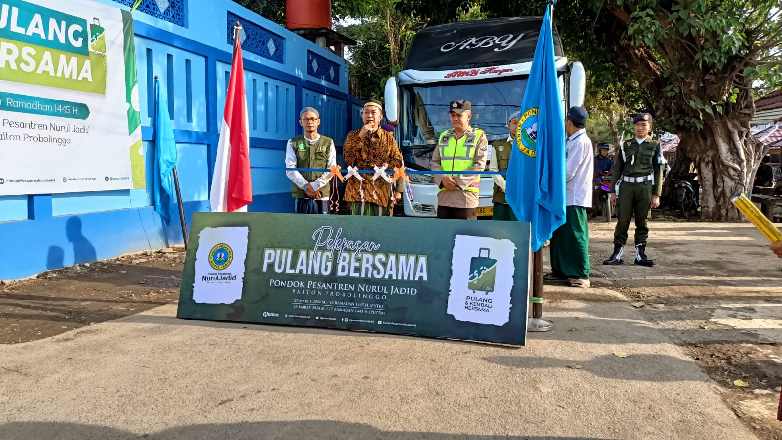Probolinggo.HarianJatim.Com- Kepala Pondok Pesantren Nurul Jadid Paiton, Probolinggo, KH. Abdul Hamid Wahid melepas keberangkatan pulang bersama santri di liburan ramadan 1445. Kamis (28/03/24) di Lapangan Ayaman Nurul Jadid.