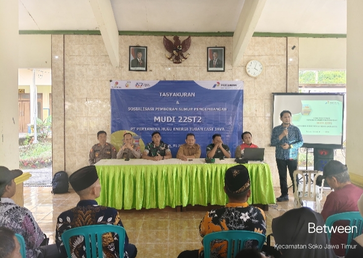 Tuban – PT Pertamina Hulu Energi Tuban East Java yang merupakan bagian dari Zona 11 Regional 4 Indonesia Timur Subholding Upstream Pertamina menggelar sosialisasi pekerjaan pemboran sumur pengembangan Mudi 22ST2 di Lapangan Mudi Blok Tuban Bersama Masyarakat Desa Rahayu Kecamatan Soko, Desa Kebonagung dan Desa Bulurejo Kecamatan Rengel Kabupaten Tuban di Kantor Desa Rahayu (01/07).