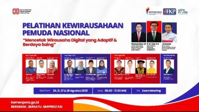 JAKARTA – Sebanyak lebih dari 700 pemuda berusia 16 hingga 30 tahun dari berbagai daerah di Indonesia antusias mengikuti Pelatihan Kewirausahaan Pemuda Nasional 2025 yang digelar secara daring pada 20, 21, 27, dan 28 Agustus 2025. Kegiatan bertema “Mencetak Wirausaha Digital yang Adaptif & Berdaya Saing” ini lahir dari kolaborasi strategis antara Kementerian Pemuda dan Olahraga Republik Indonesia (KEMENPORA RI) melalui Deputi Bidang Pelayanan Kepemudaan bersama Dewan Pengurus Pusat Forum Kewirausahaan Pemuda (DPP FKP).