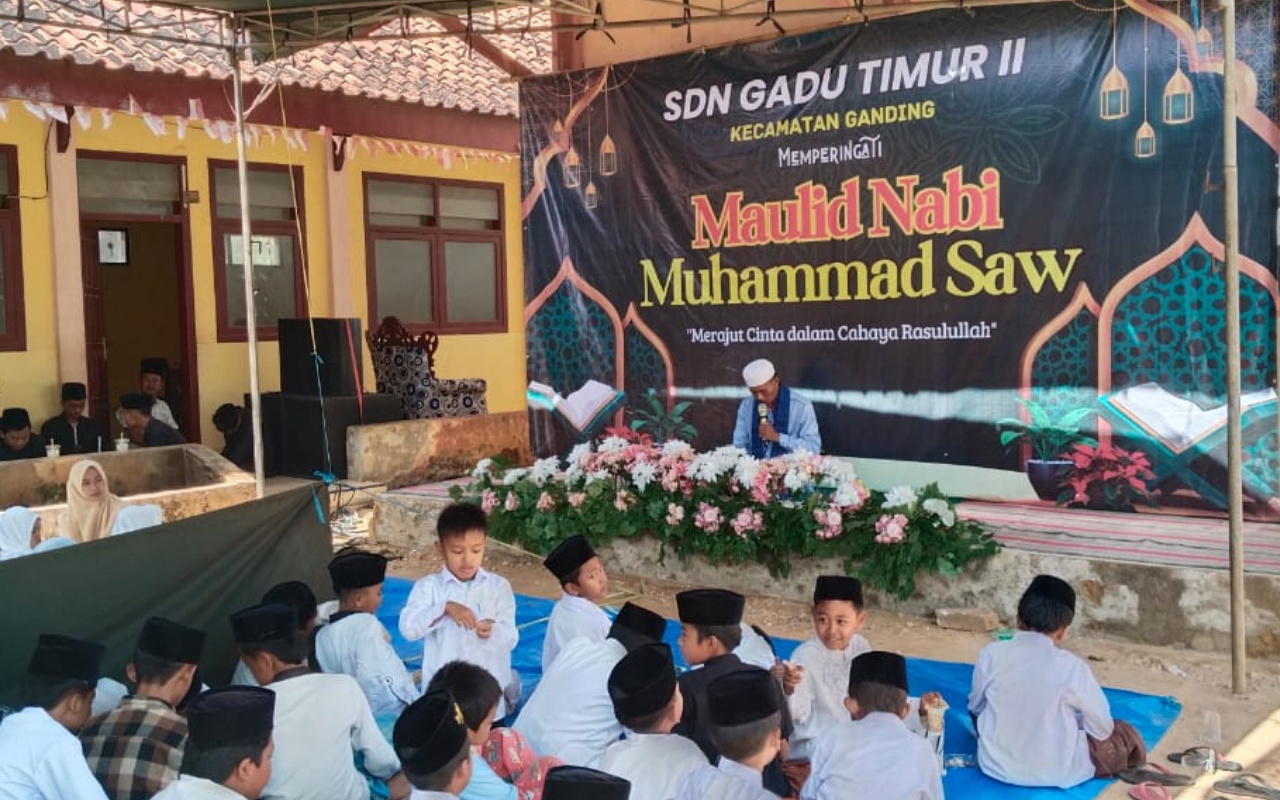 Sumenep-harianjatim.com. Sekolah Dasar Negeri (SDN) Gadu Timur, Kecamatan Ganding, Sumenep, Jawa Timur menggelar perayaan Maulid Nabi Muhammad SAW, Jumat, (12/05/2025).
