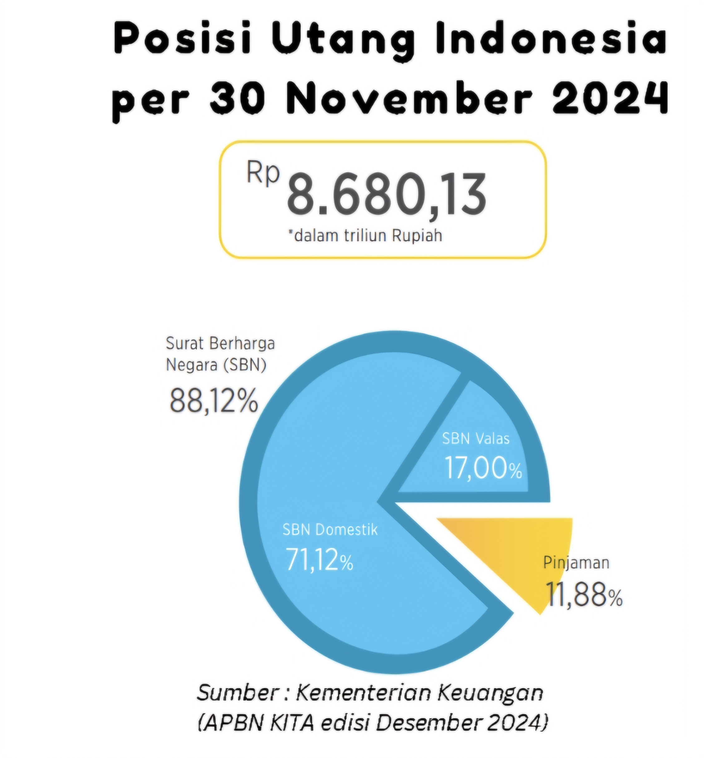 Pemulihan ekonomi di tahun 2025 membuat posisi utang negara Indonesia berapa pada posisi Rp 8.680,13 Triliun per november 2024 dan untuk rincian utang adalah sebagai berikut: