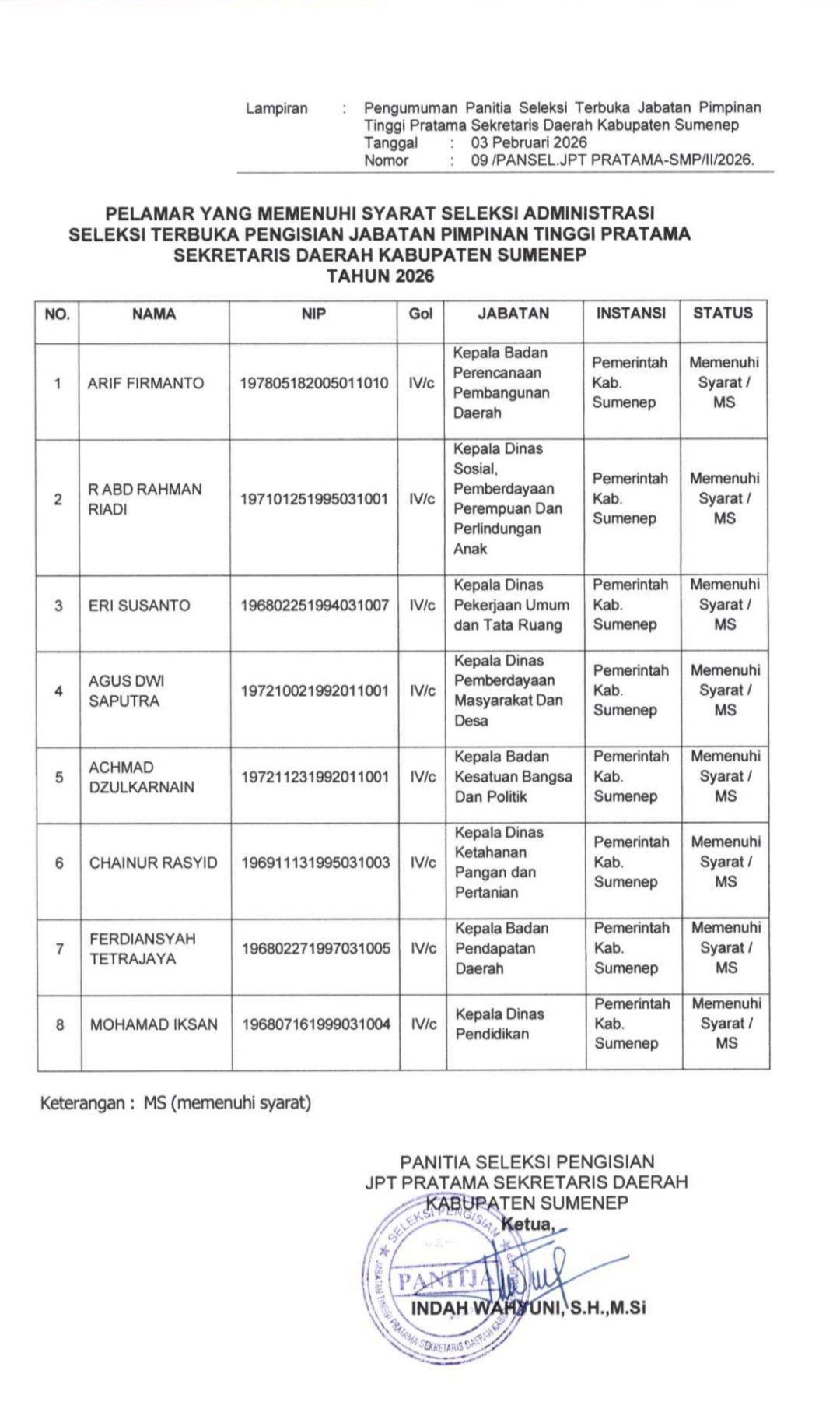 8 Kandidat Lolos Seleksi Adminitrasi Sekda Sumenep, Berikut Jadwal Assessmen (foto: tamplet pengumuman)